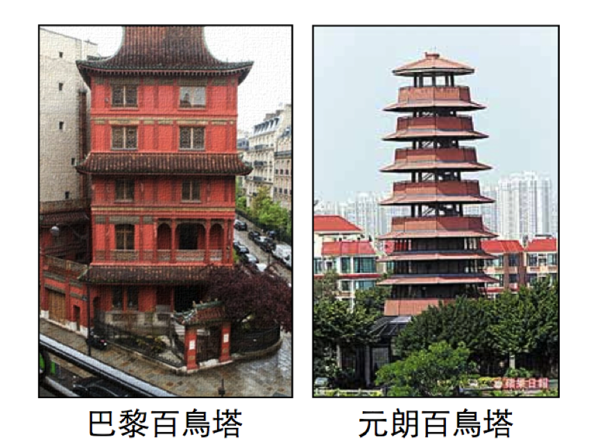 元朗公園這裡有一座建築物,形狀像方尖碑、尖沙咀鐘樓、以及日華牧師留學溫哥華時的住處,就是中式建築的八角形百鳥塔(Aviary Pagoda)。同樣,巴黎凱旋門附近,亦有一個中式設計的百鳥塔(Pagoda Paris)。