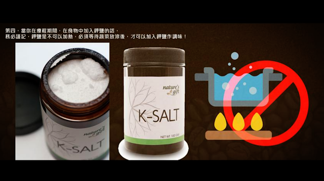 當你在療程期間,在食物中加入鉀鹽的話,務必謹記,鉀鹽是不可以加熱,必須等待蔬菜放涼後,才可以加入鉀鹽作調味!另外,有腎病或腎功能障礙的人士,切忌使用鉀鹽,因為,有可能會導致高鉀血症!